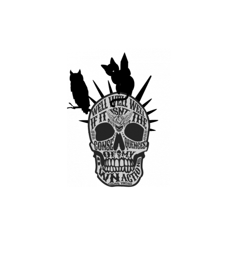 a cat and an owl on spikey skull - with well well