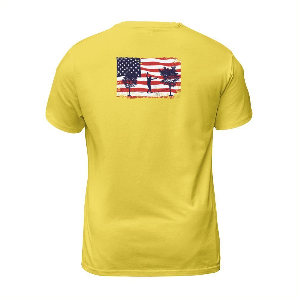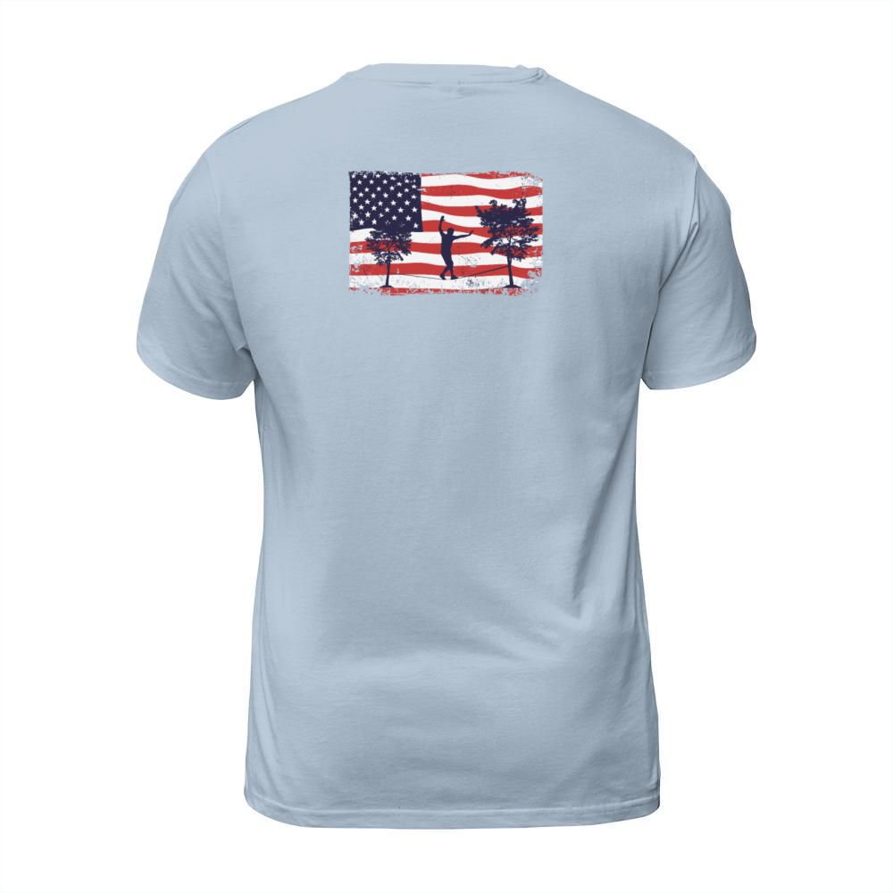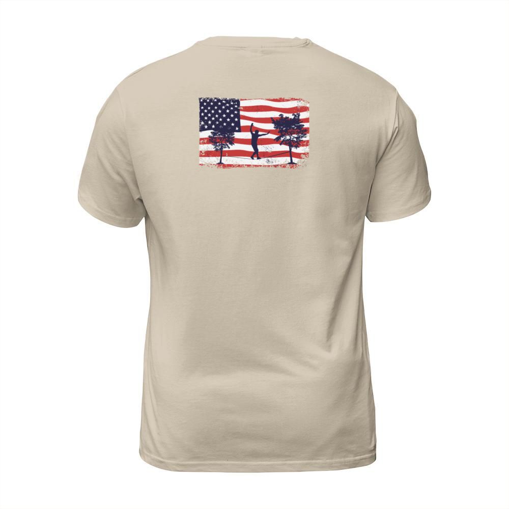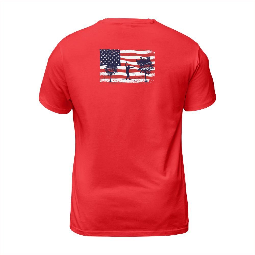 Shop American flag Slackline T-Shirt Unisex custom made just for you. Available on many styles, sizes, and colors.