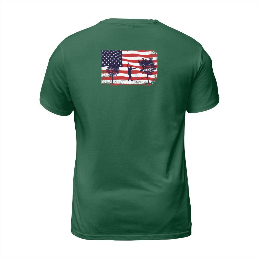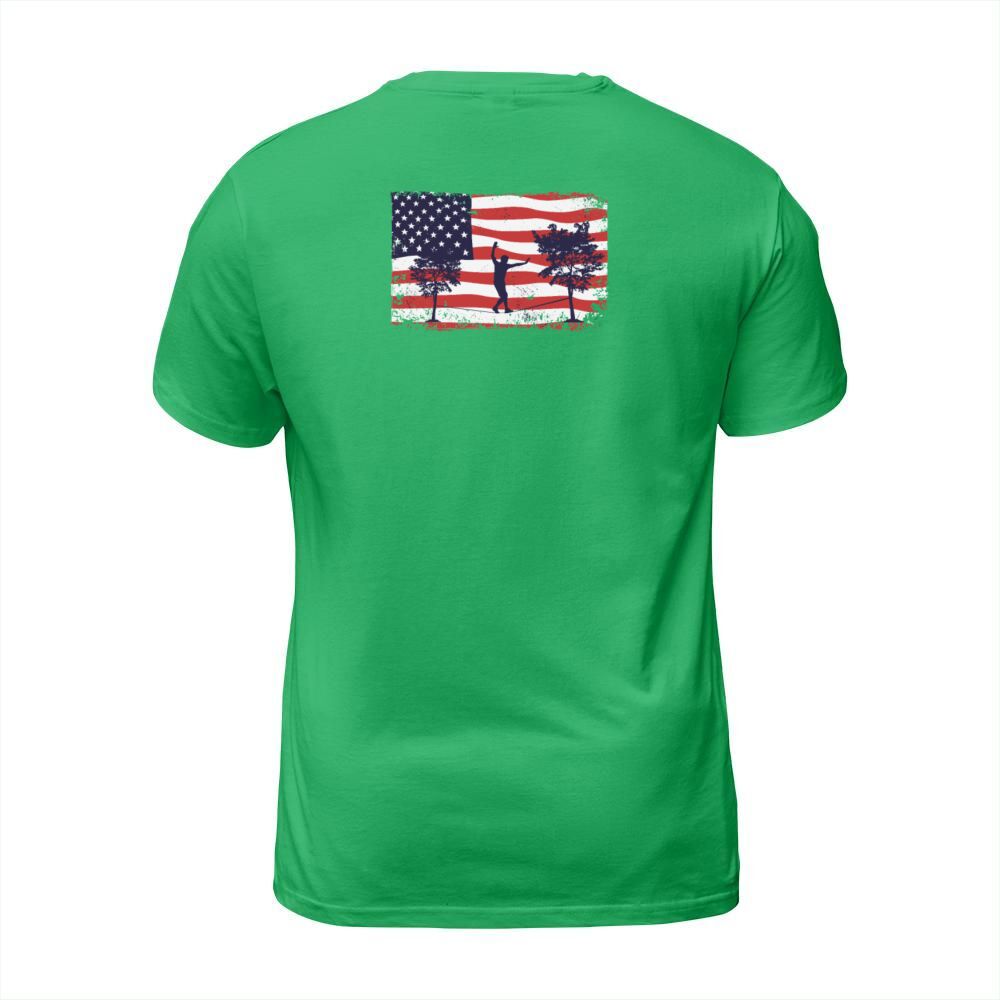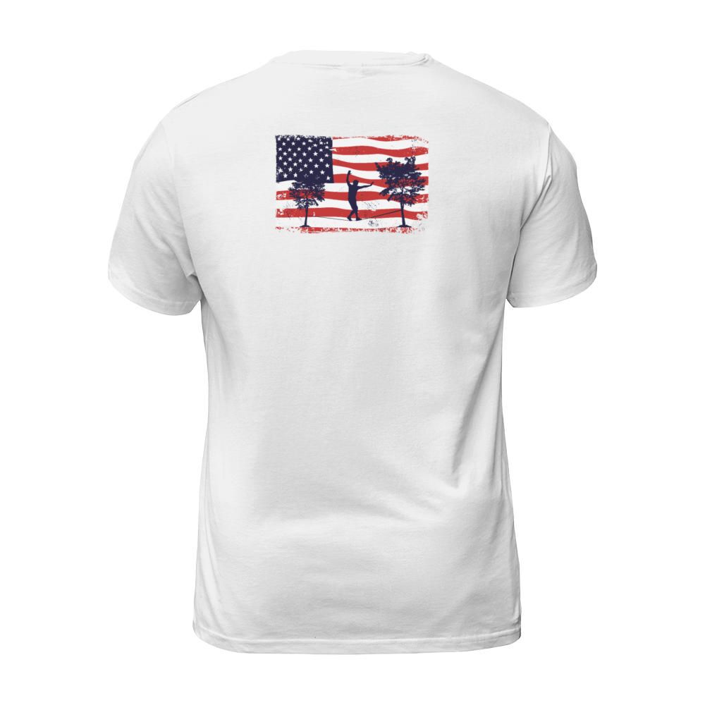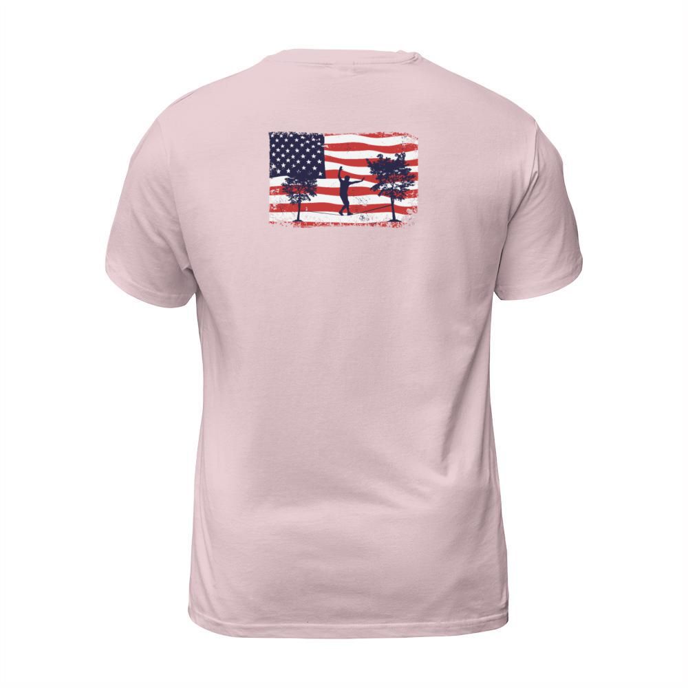 Shop American flag Slackline T-Shirt Unisex custom made just for you. Available on many styles, sizes, and colors.