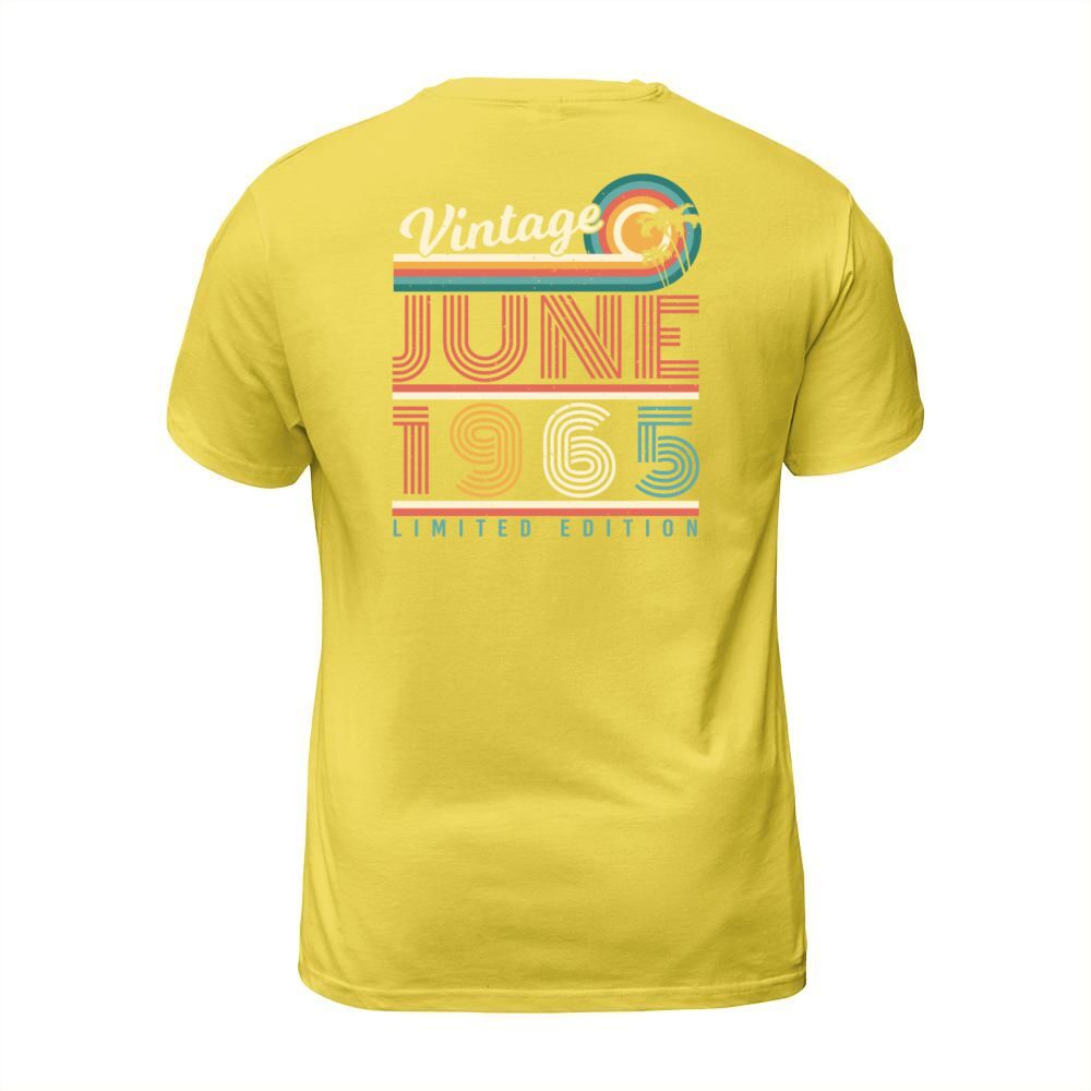 Shop Birthday Greeting 1965 June T-Shirt Unisex custom made just for you. Available on many styles, sizes, and colors.