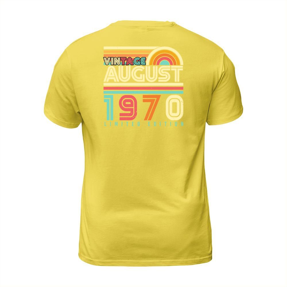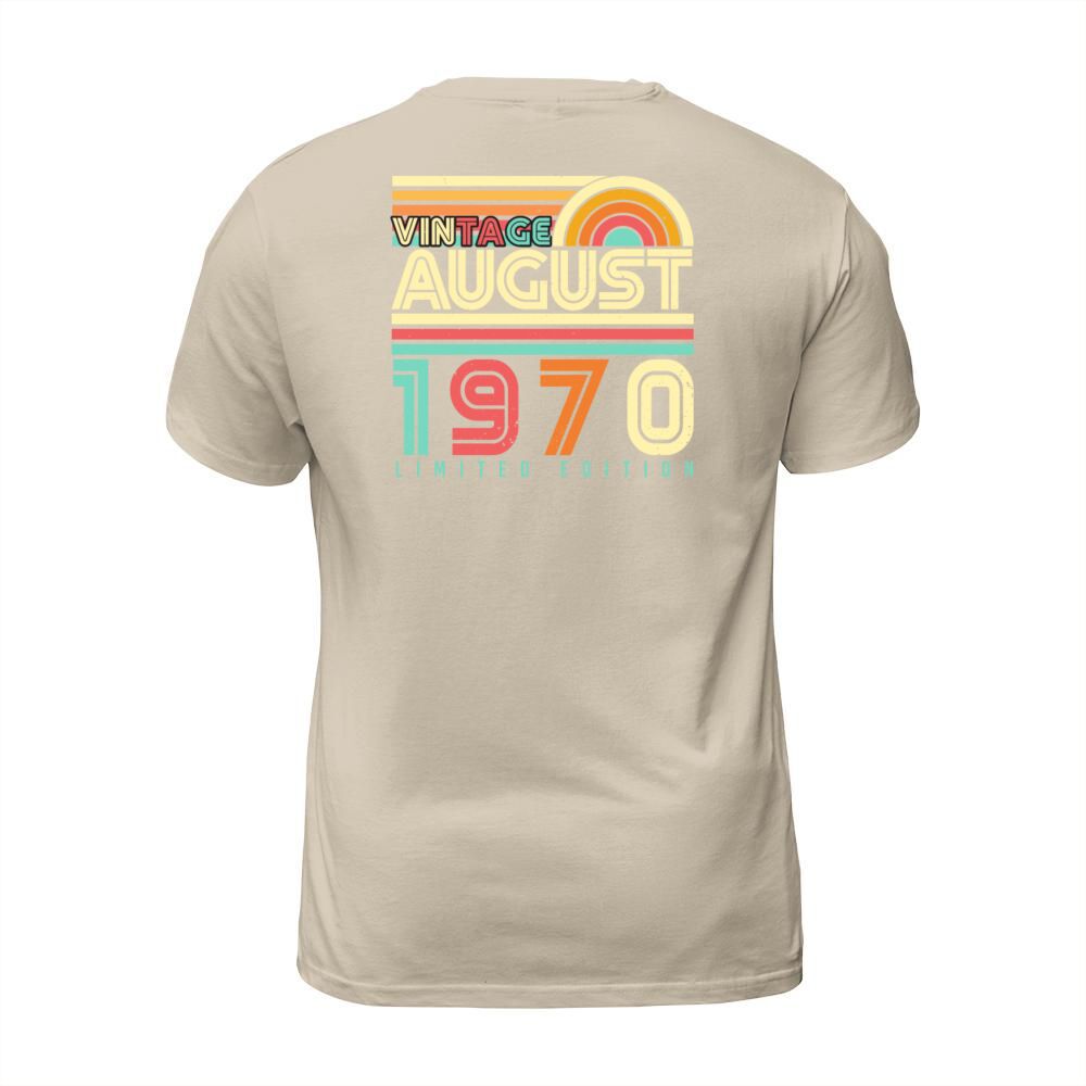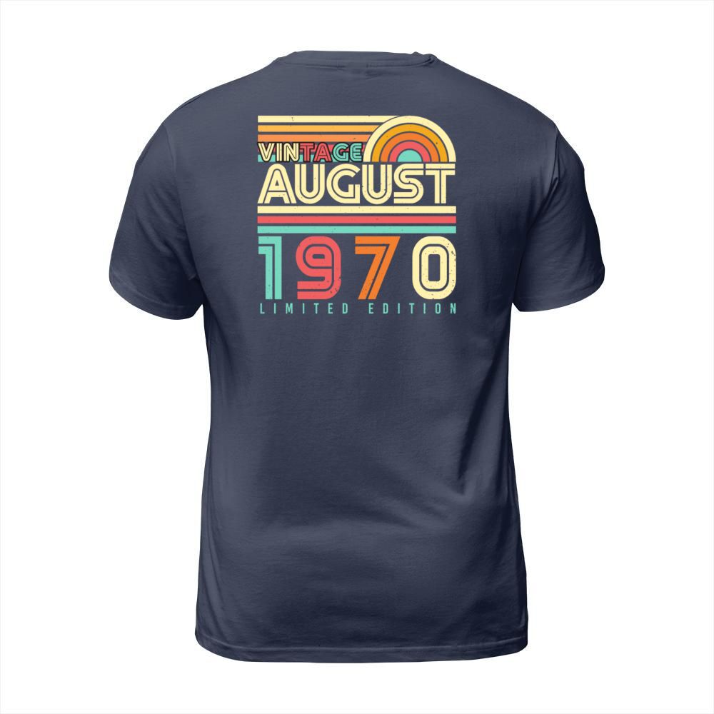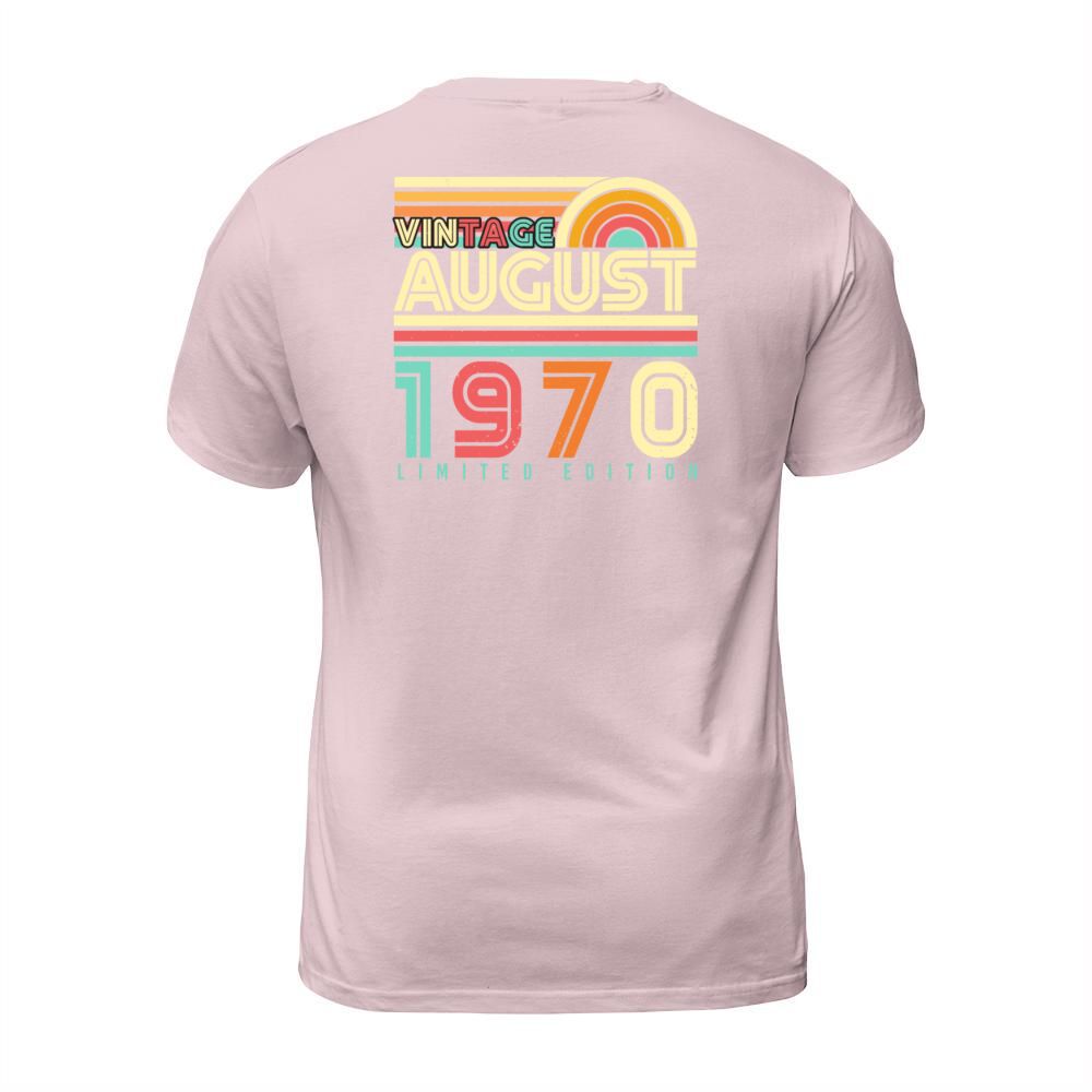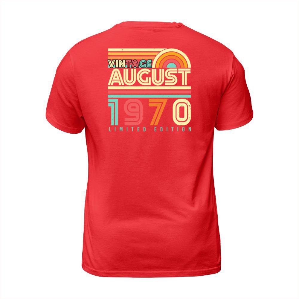 Shop Birthday Greeting August 1970 T-Shirt Unisex custom made just for you. Available on many styles, sizes, and colors.
