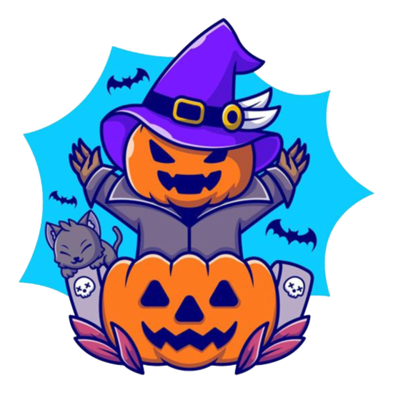 Cute witch pumpkin with cat and bat