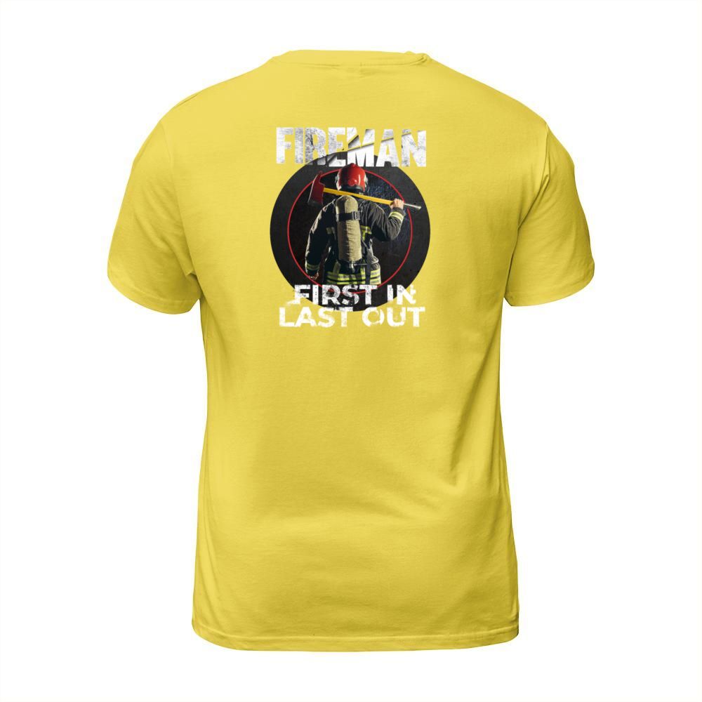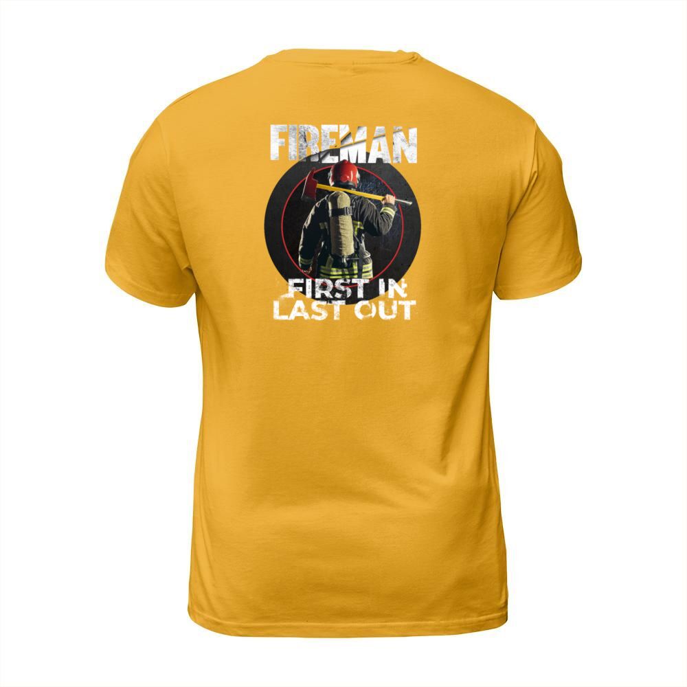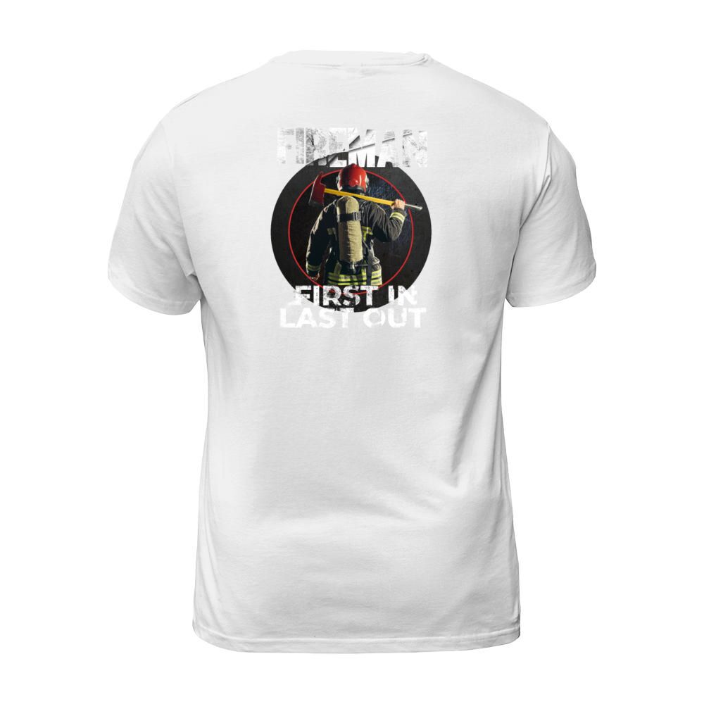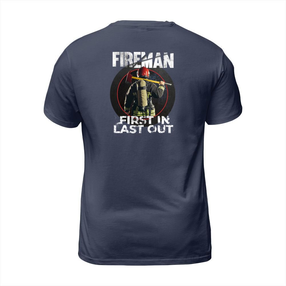 Shop Fireman - First In Last Out - Firegfighter Men's T-Shirt custom made just for you. Available on many styles, sizes, and colors.