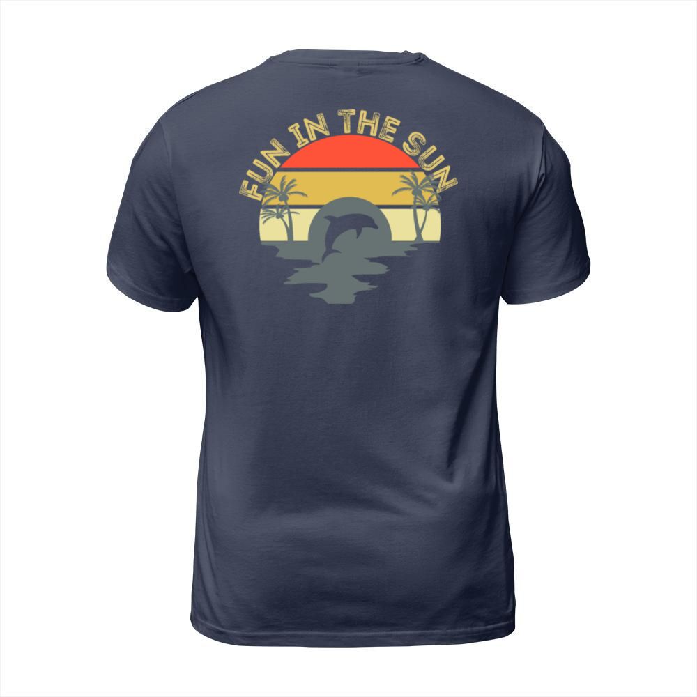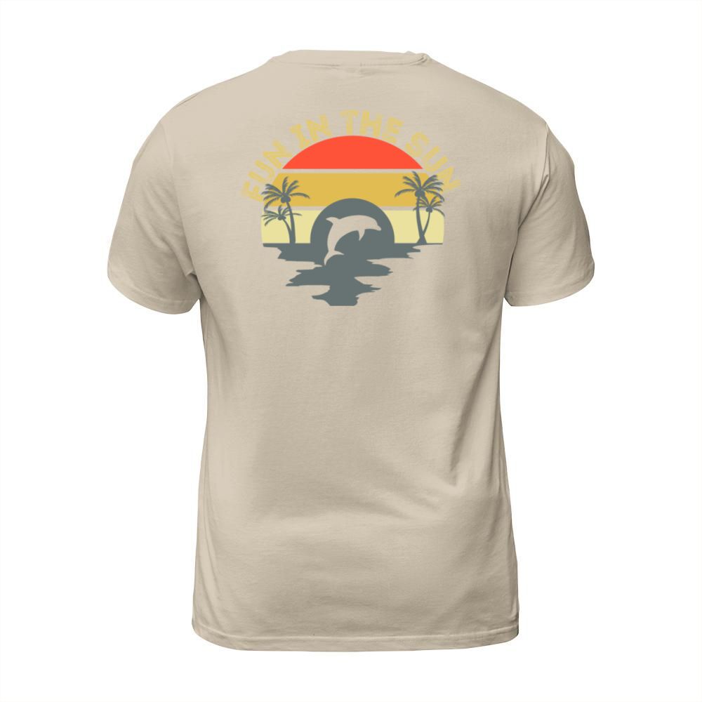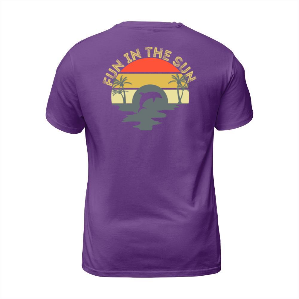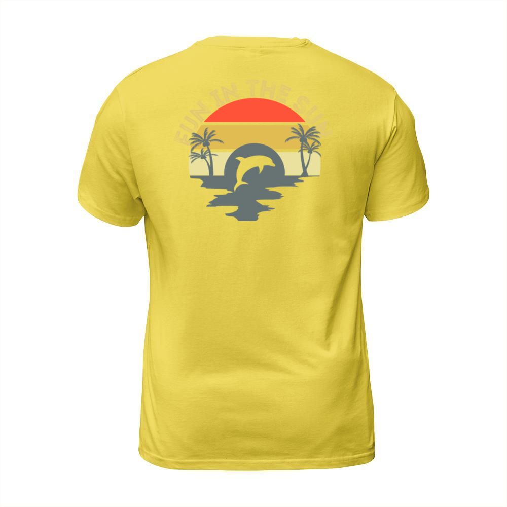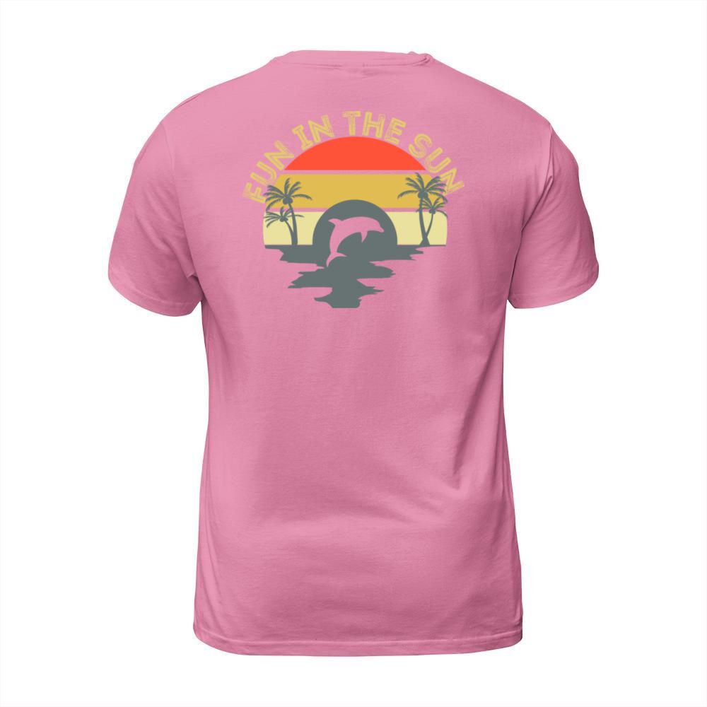 Shop Fun In The Sun Dolphin Palm Trees Retro Sunset T-Shirt Unisex custom made just for you. Available on many styles, sizes, and colors.