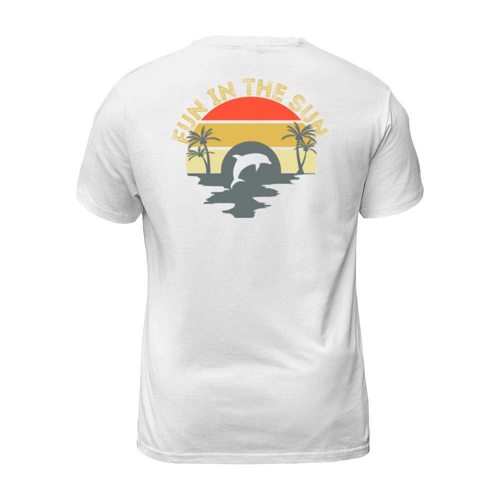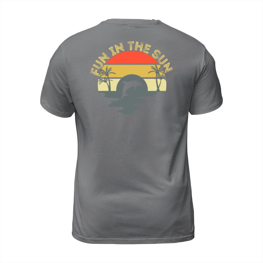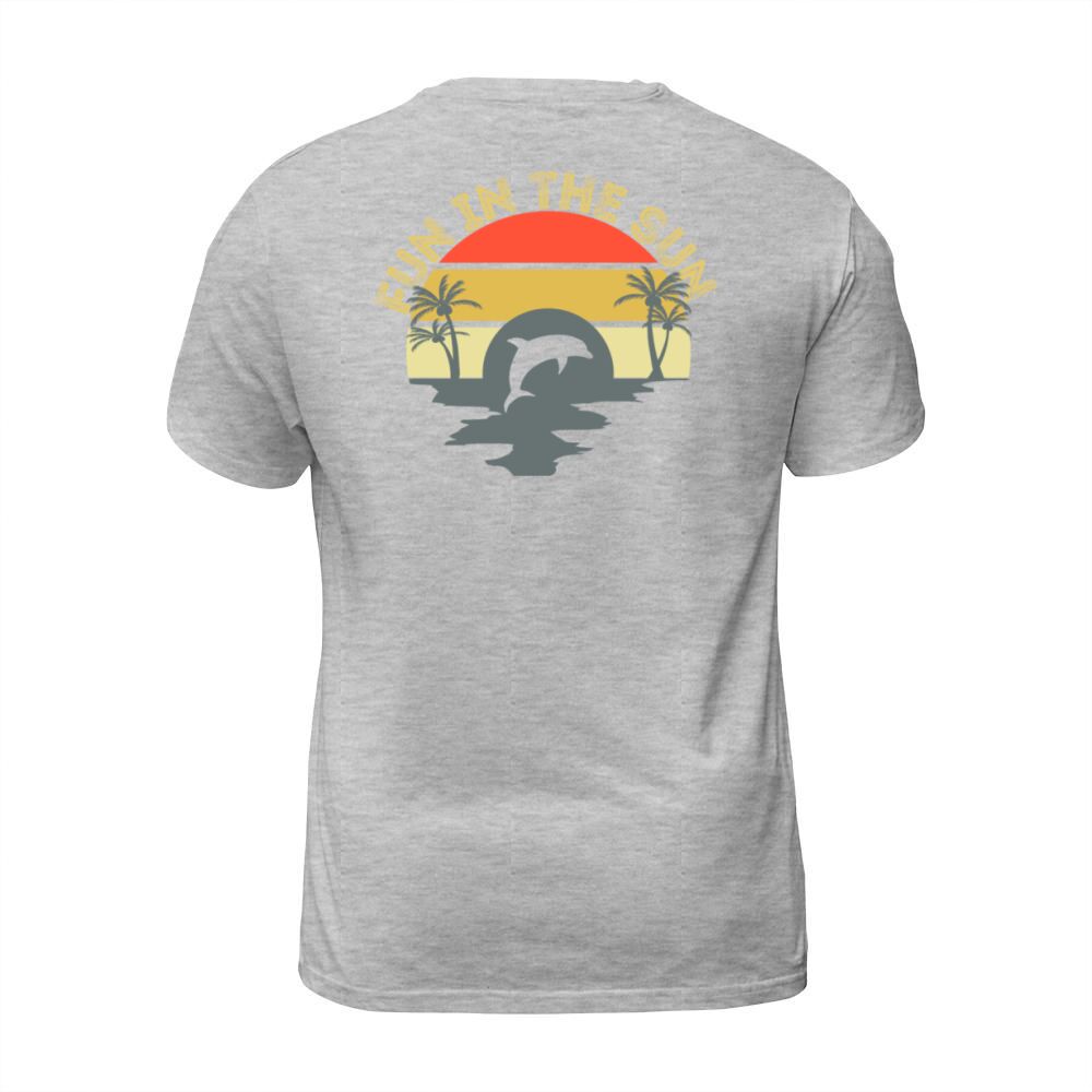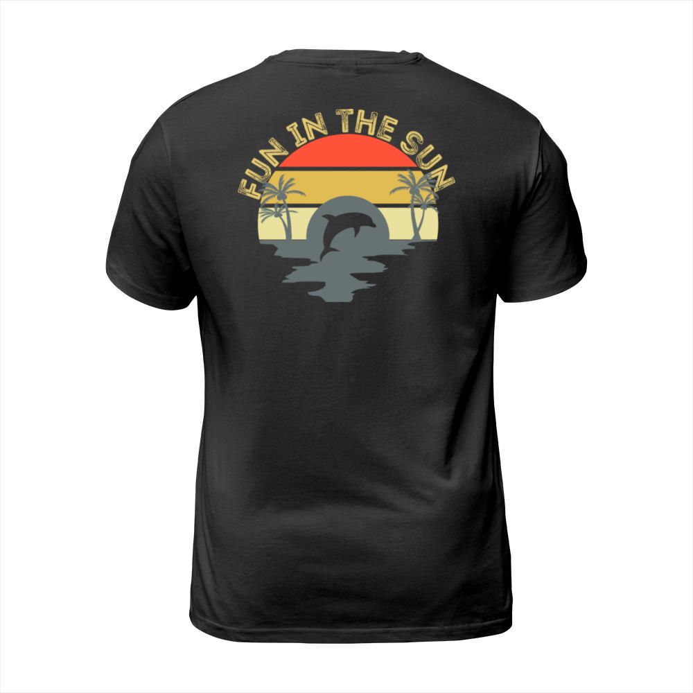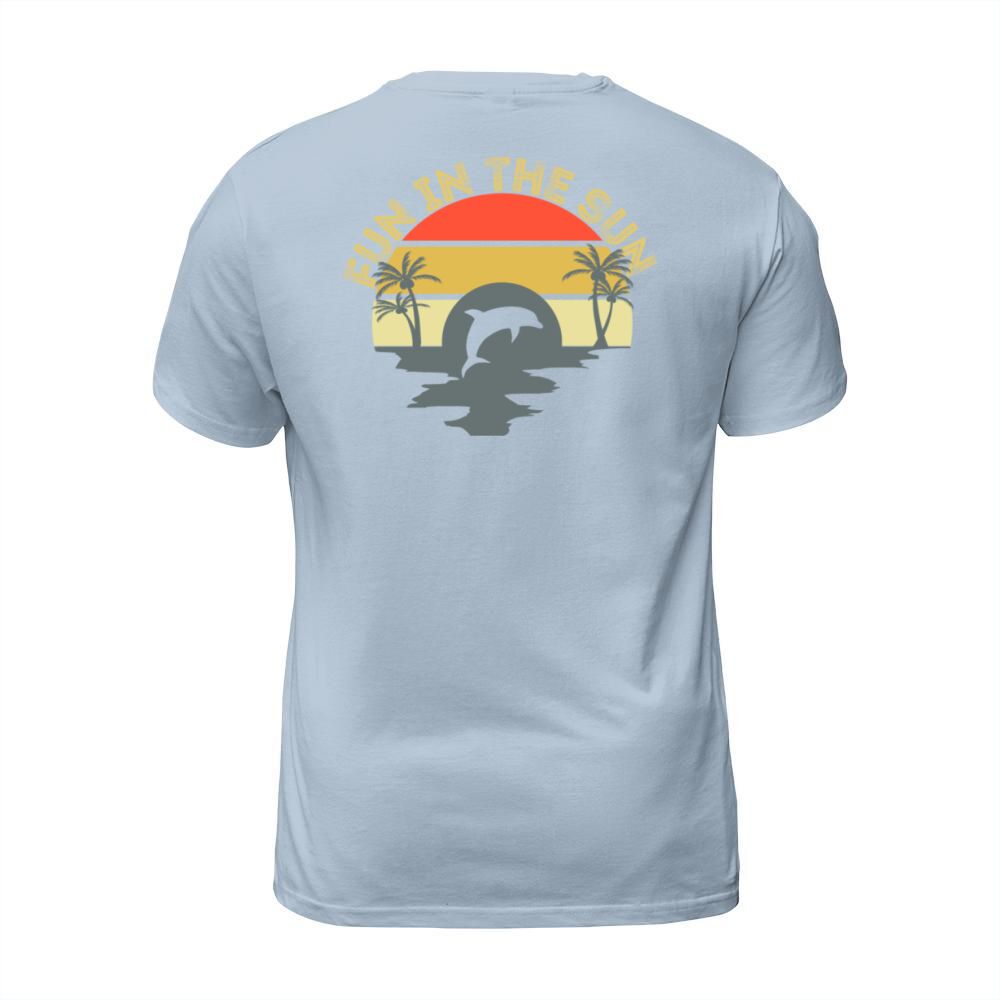 Shop Fun In The Sun Dolphin Palm Trees Retro Sunset T-Shirt Unisex custom made just for you. Available on many styles, sizes, and colors.