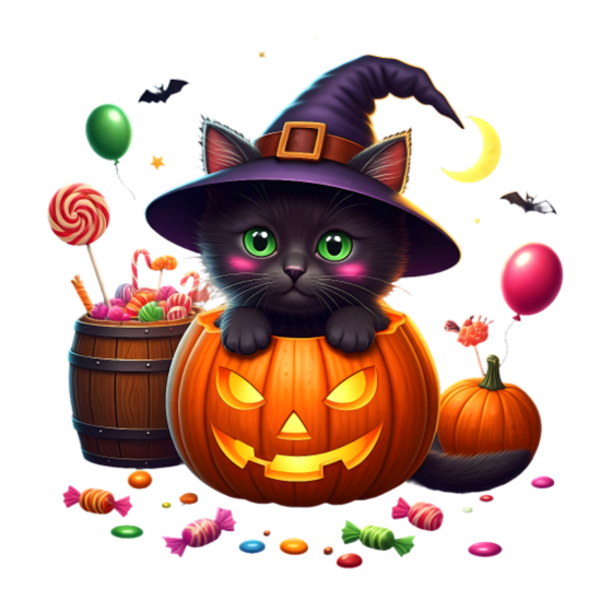 Halloween Black Cat in Pumpkin with Witch Hat