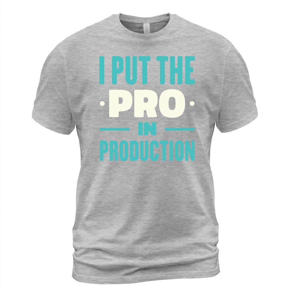 Shop I Put The Pro In Production T-Shirt Unisex custom made just for you. Available on many styles, sizes, and colors.