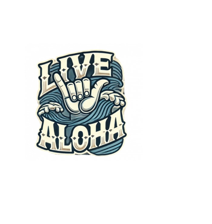 Live Aloha in large wavy retro style shaka hand