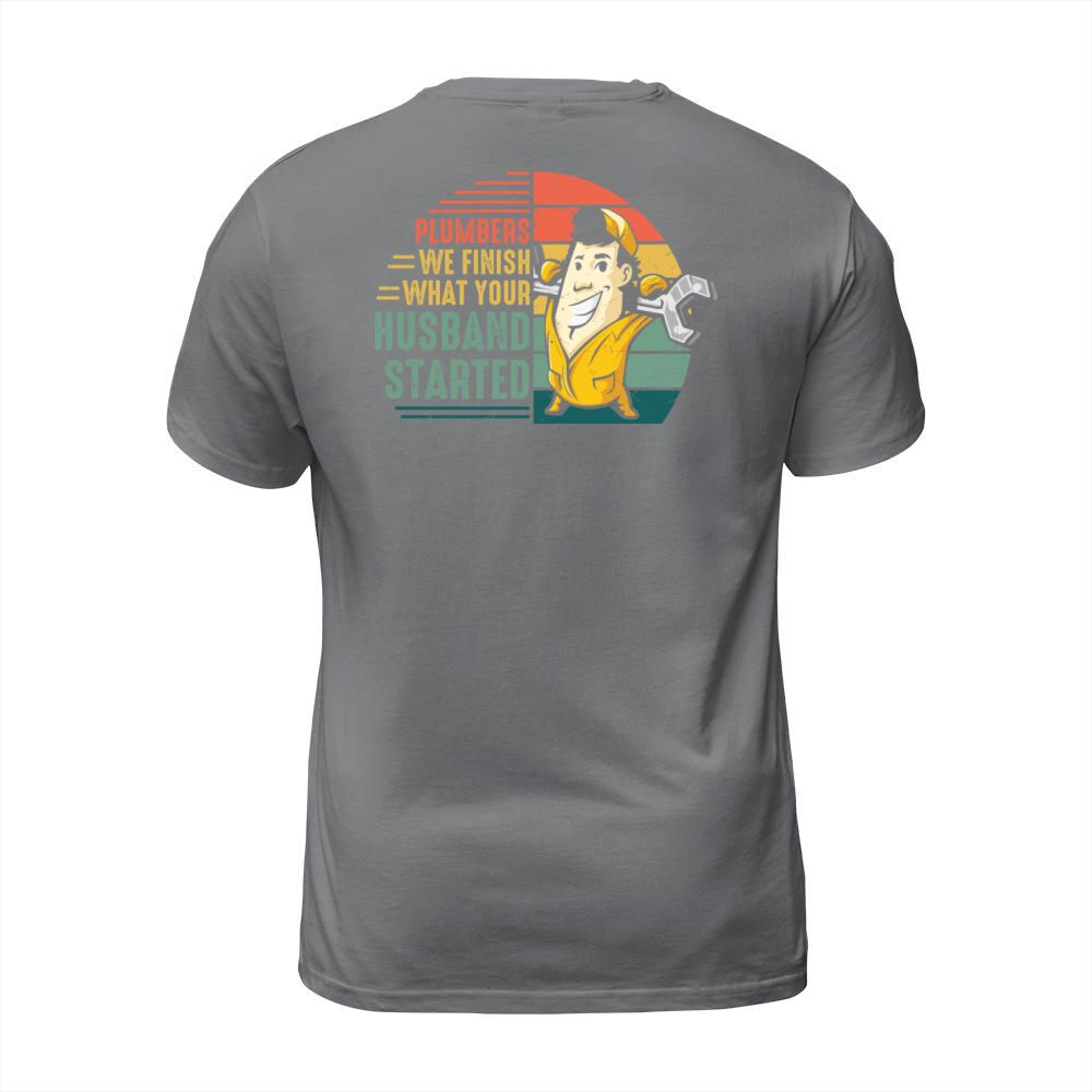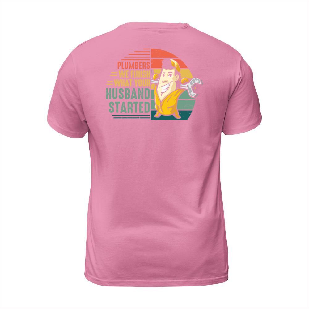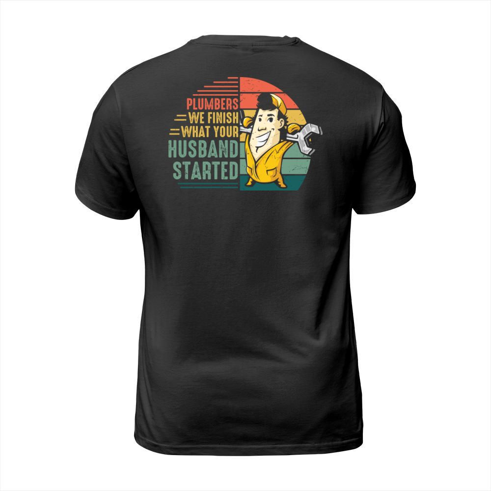 Shop Plumbers we finish what your husband started T-Shirt Unisex custom made just for you. Available on many styles, sizes, and colors.