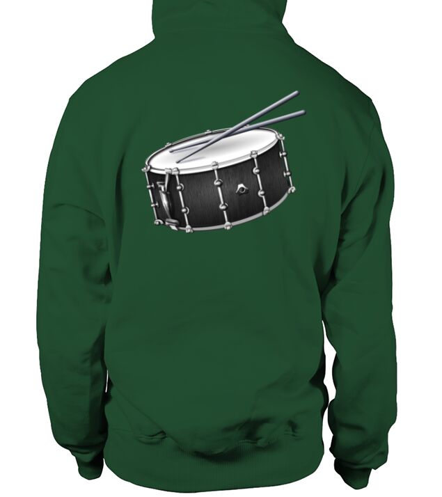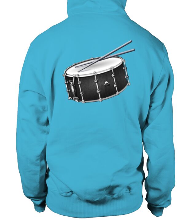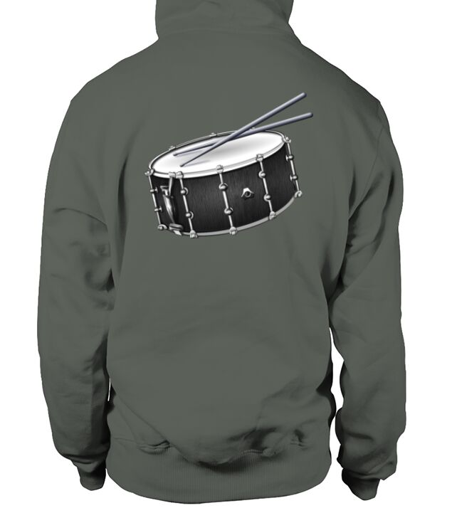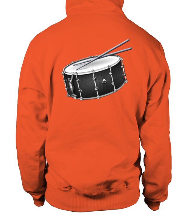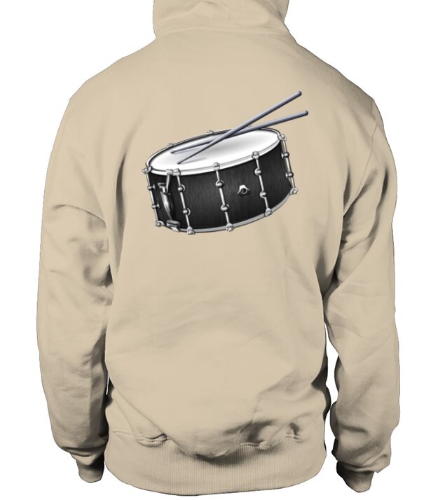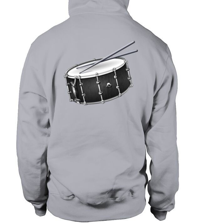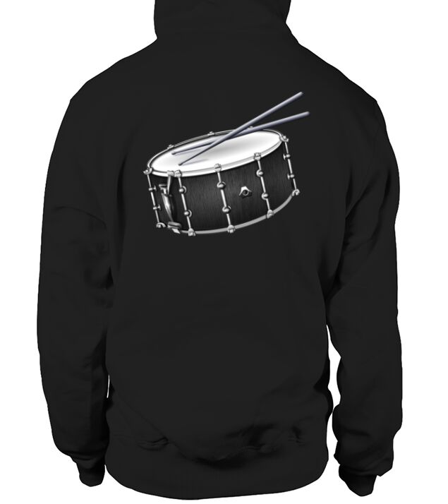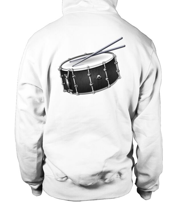 a drummer's snare drum and drum sticks design in hoodie unisex